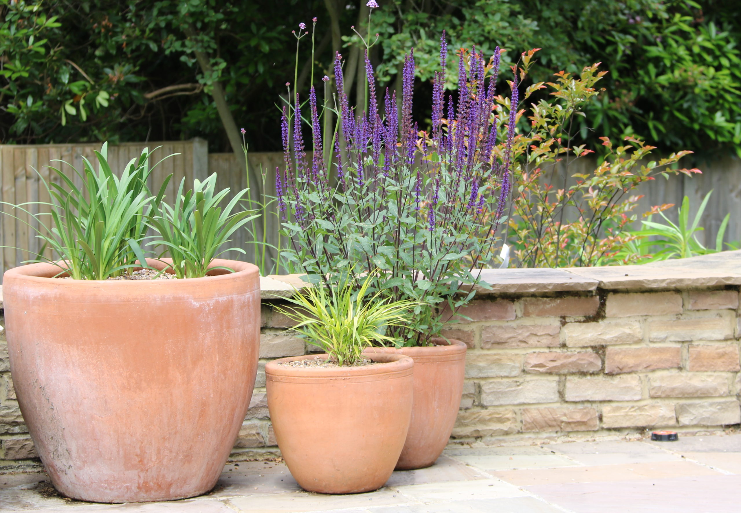 - Total re-planting of patio pots to integrate into the new garden planting schema.